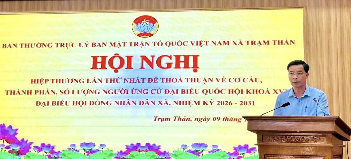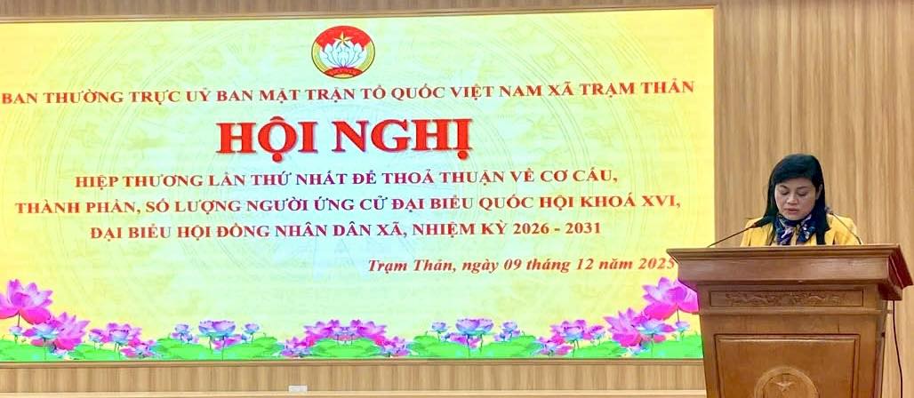 Chiều ngày 9/12/2025 Ban Thường trực Uỷ ban MTTQ Việt Nam xã Trạm Thản tổ chức Hội nghị Hiệp thương lần thứ I. Dự và chỉ đạo hội nghị có đồng chí Nguyễn Quang Vinh- Bí thư Đảng uỷ- Chủ tịch HĐND; đồng chí Trần Như Tuấn– Phó Bí thư Đảng uỷ, Chủ tịch UBND xã, Phó Ban Thường trực Ban chỉ đạo, Chủ tịch Uỷ ban bầu cử Đại biểu HĐND xã, đồng chí Nguyễn MInh Quân - Phó Bí thư Thường trực Đảng uỷ, Phó trưởng Ban chỉ đạo; Các đồng chí lãnh đạo Thường trực HĐND; Ban Thường trực UBMTTQ xã và các vị đại biểu đại diện lãnh đạo các tổ chức thành viên MTTQ xã.