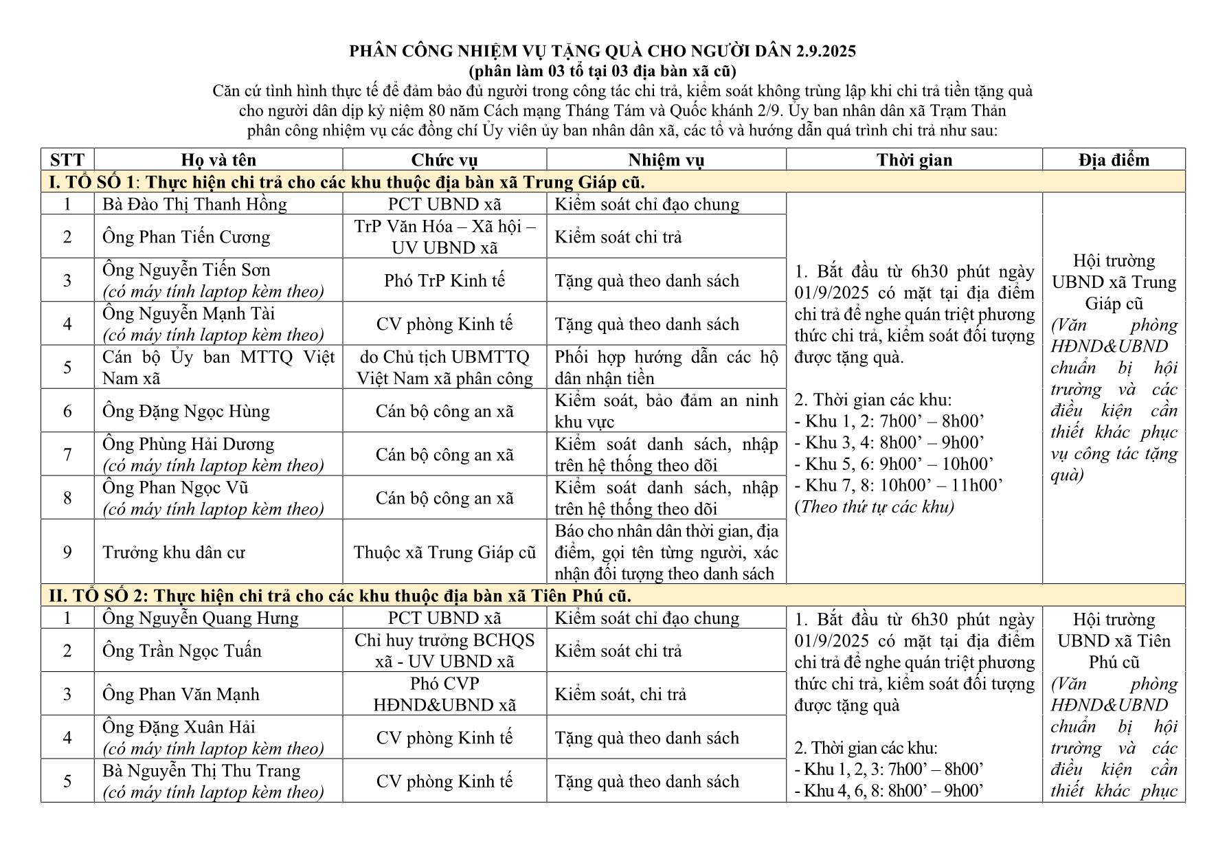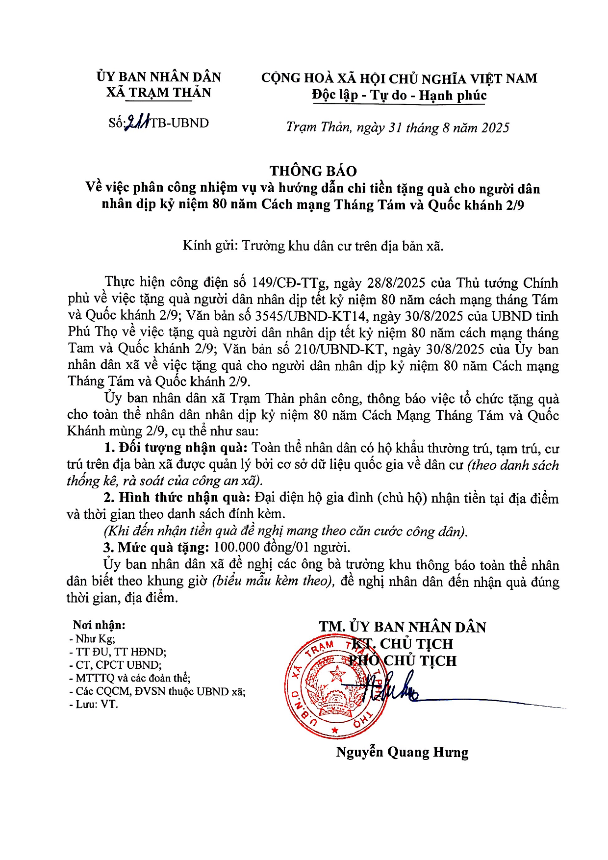 Thông báo về việc phân công nhiệm vụ và hướng dẫn chi tiền quà tặng cho người dân nhân dịp Kỷ niệm 80 năm Cách mạng Tháng Tám và Quốc khánh 2/9