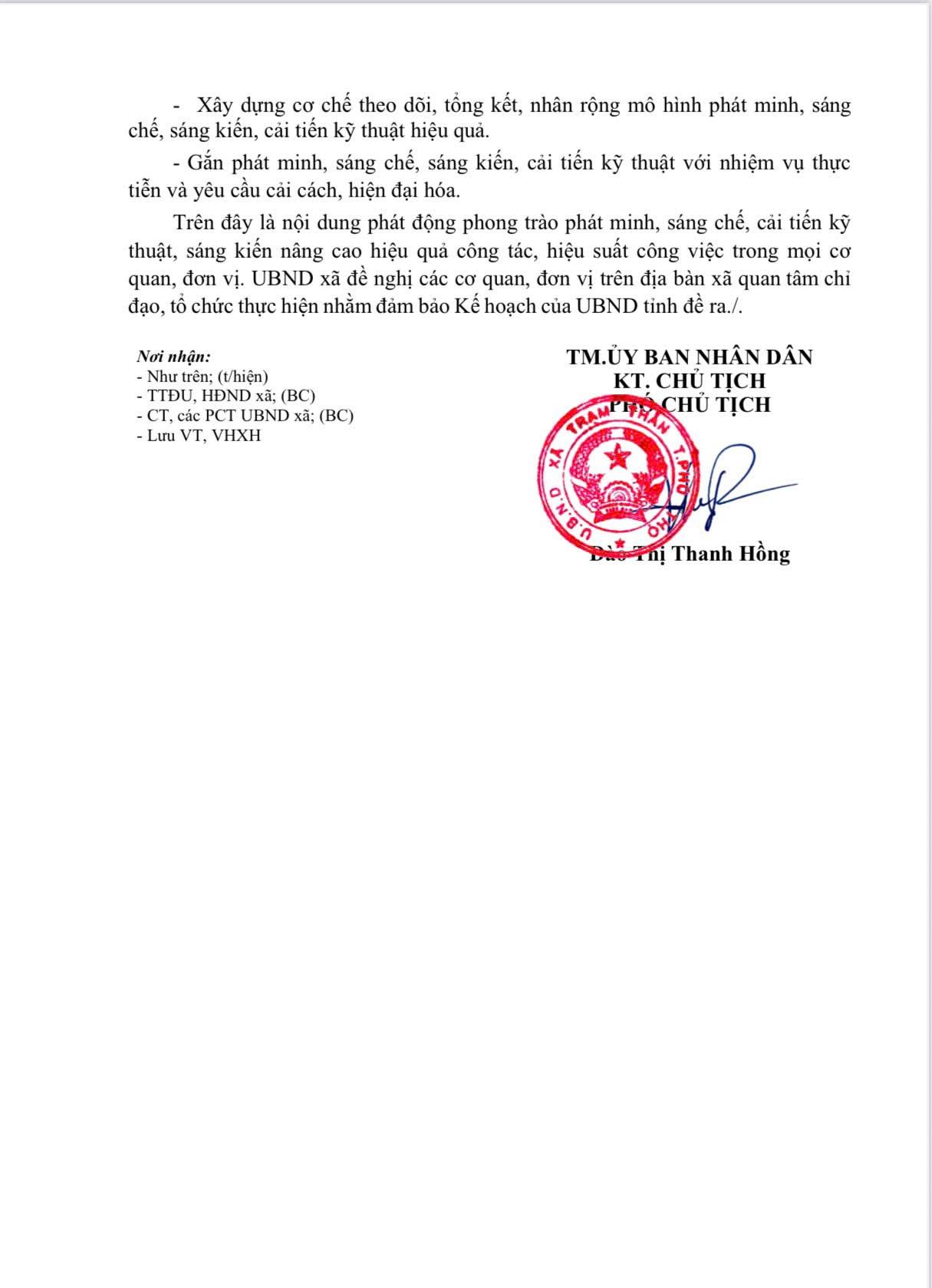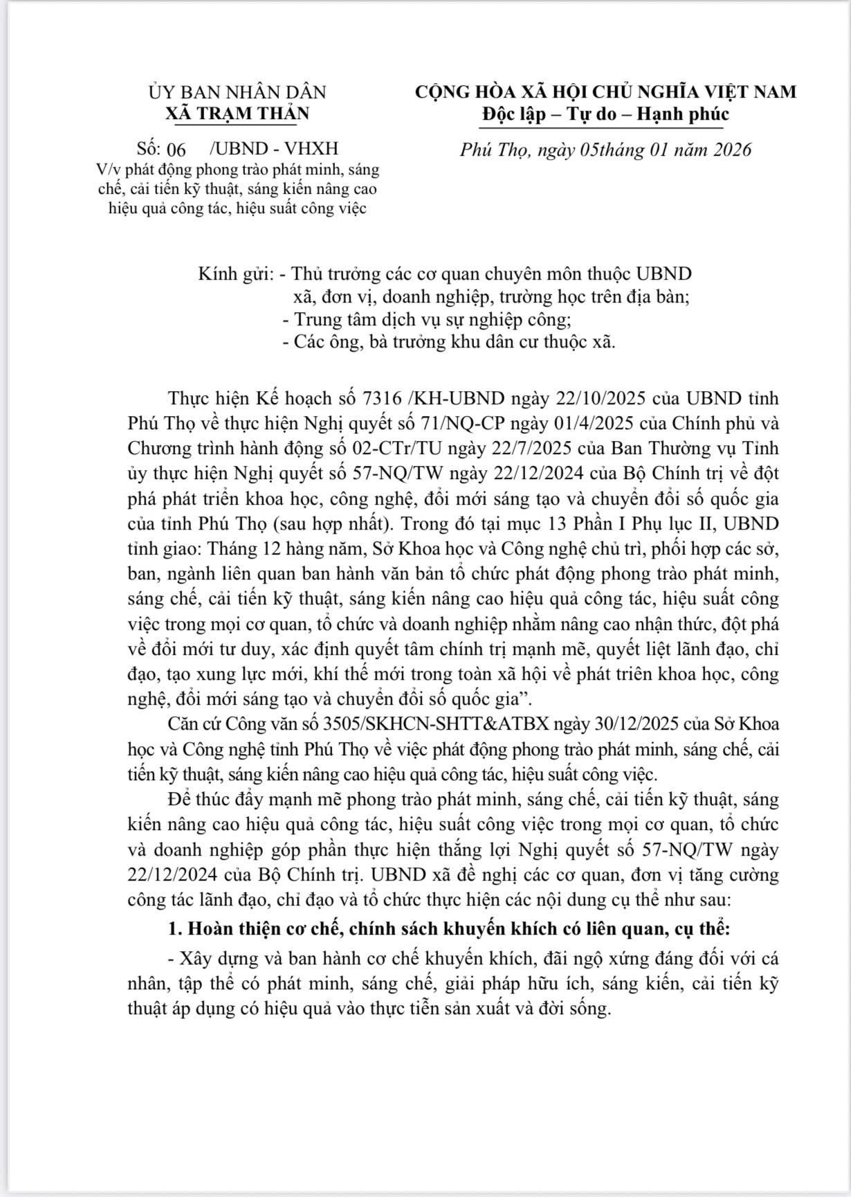 🗓 Ngày 05/01/2025, UBND xã Trạm Thản ban hành Văn bản số 06/UBND-VHXH về việc phát động phong trào phát minh, sáng chế, cải tiến kỹ thuật, sáng kiến nâng cao hiệu quả công tác, hiệu suất công việc.